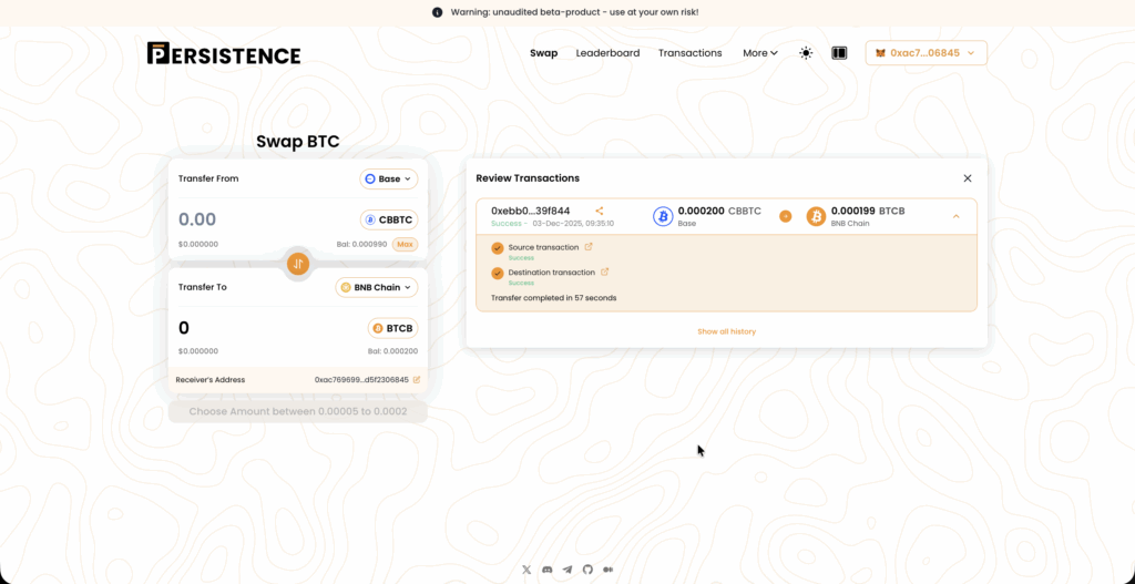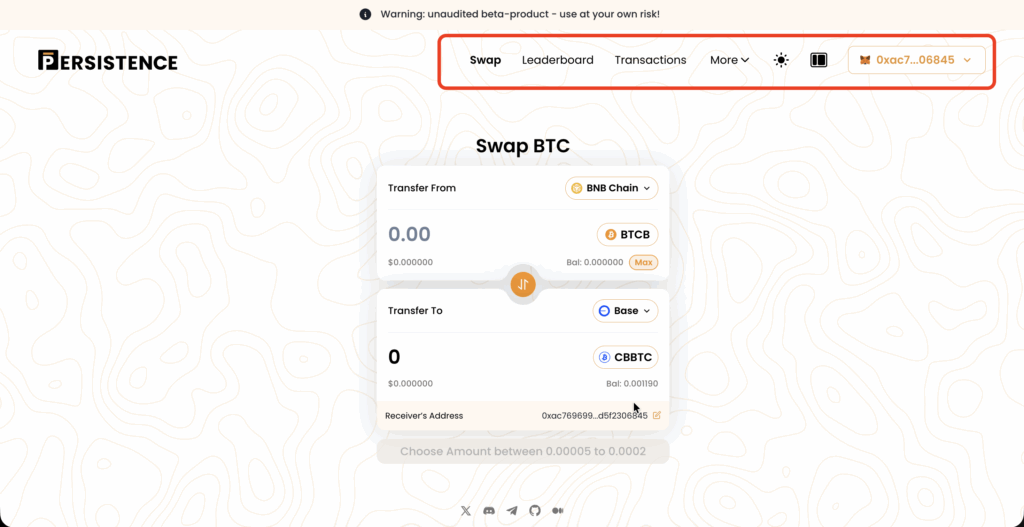 Participation in the campaign is entirely voluntary and free of charge. However, please be aware that you will need a small amount of the gas fee token for the source chain (ETH or BNB), as well as either CBBTC or BTCB, to execute swaps within the product. Note that the maximum swap limit is restricted to a range of 0.00005 to 0.0002 per order.