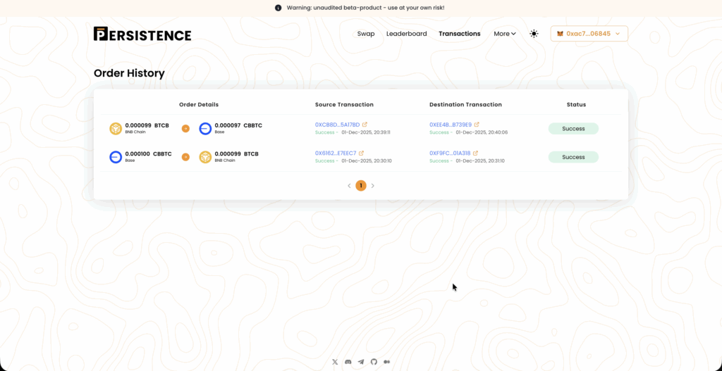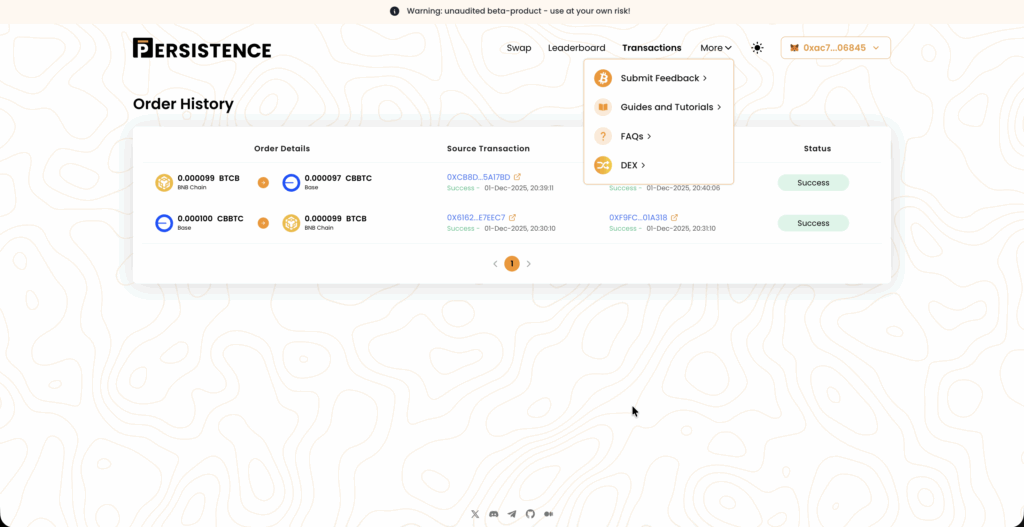You can monitor the status of your swaps under the ‘Transactions’ tab in the menu bar. If you notice any discrepancies, please inform the team or include details in your feedback.