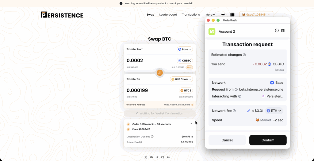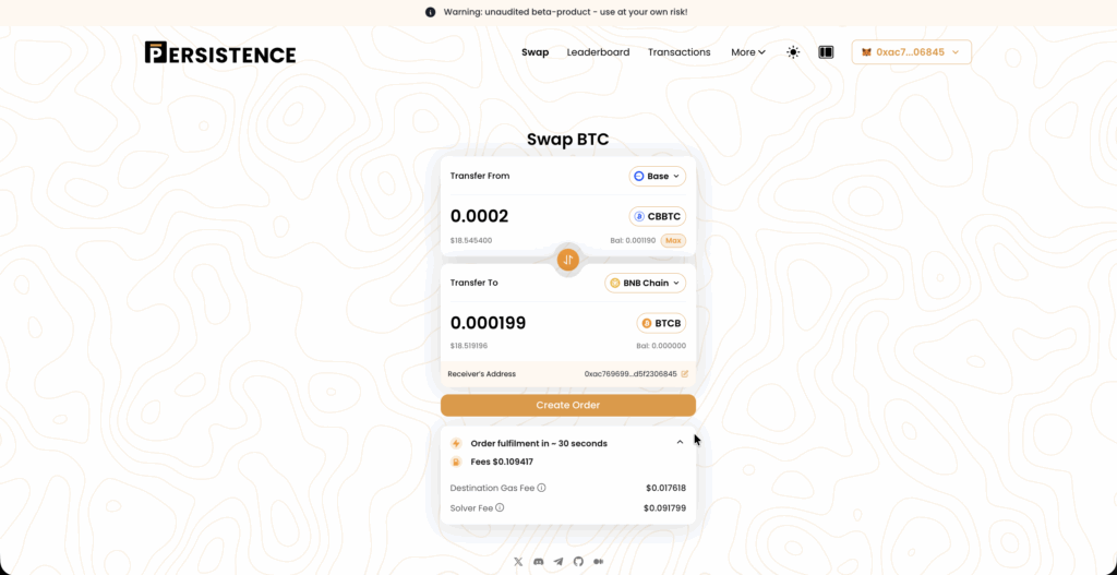 You will need a small amount of the gas fee token on each chain (ETH and BNB), along with the BTC variant you plan to swap (CBBTC or BTCB). Please note that the swap amount is currently limited to a range between 0.00005 and 0.0002 per order, which is roughly 5 to 20 USD.