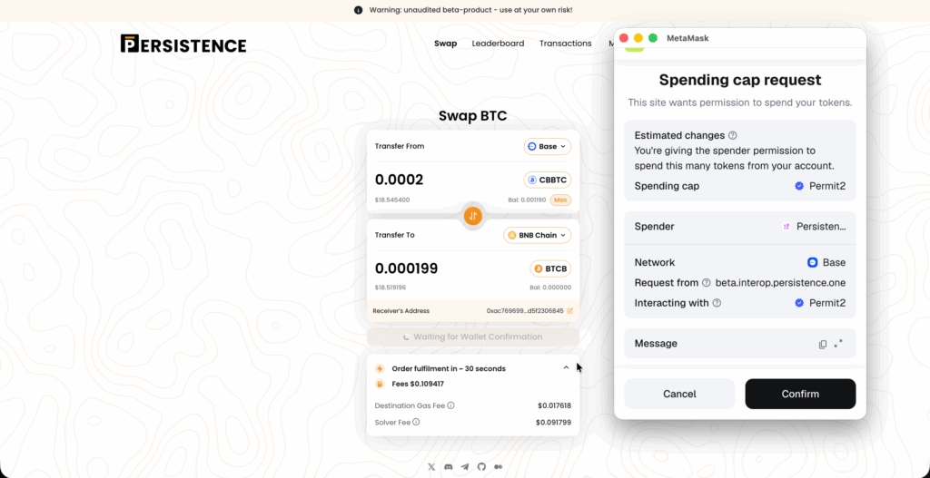 Our cross-chain solution uses Intents to fulfil orders, which enhances efficiency, security, and speed compared to traditional bridges with liquidity pools. When you place an order, funds are escrowed on the Persistence One contract on the source chain until the solver fulfils your intent on the destination chain.