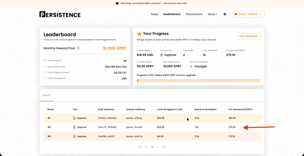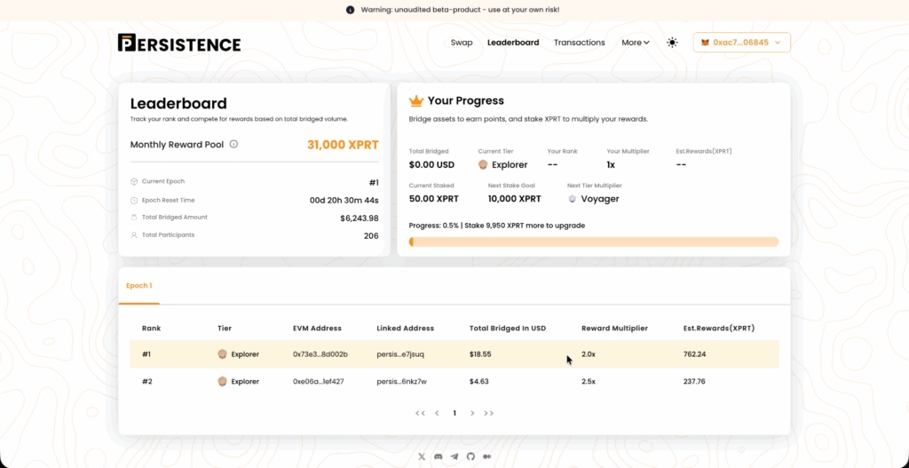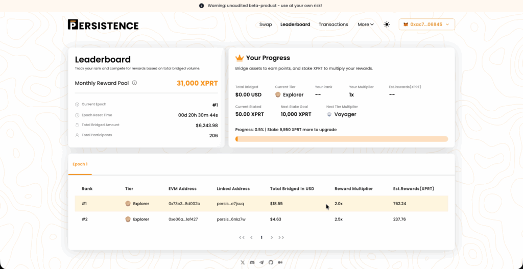 The Leaderboard page shows the number of participants in the ongoing epoch along with the previous epoch, their rewards, bridge volume, tiers and ranks.