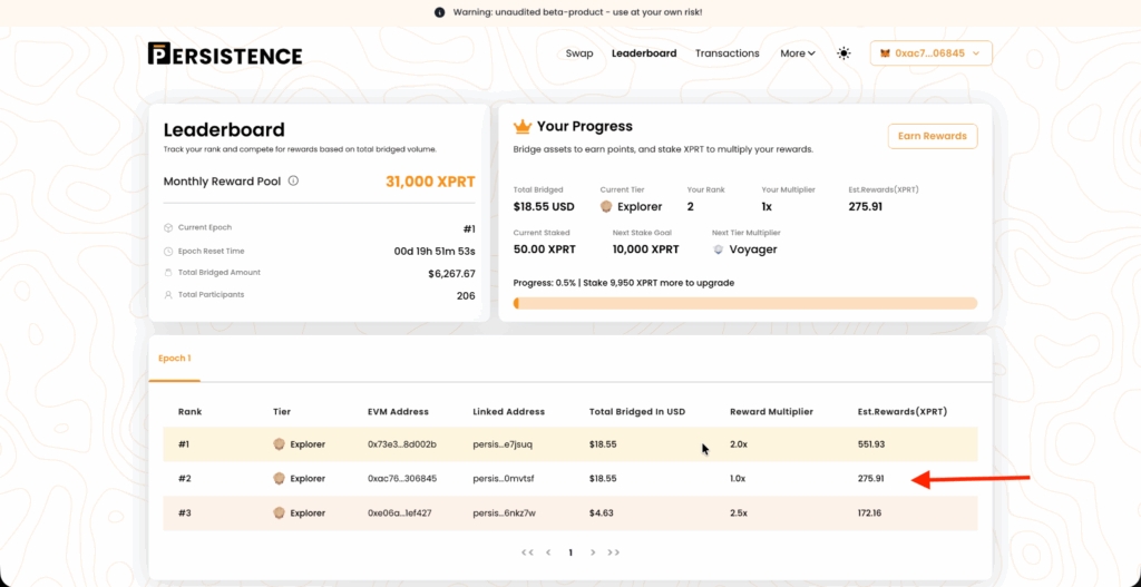 Now you have completed the tasks required to rank in the ongoing epoch. You can check your progress by navigating to the Leaderboard page to see your expected reward for the epoch. You can bridge more volume to climb higher in the rankings.